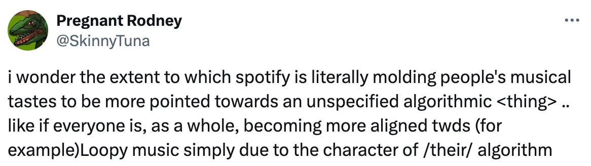 I’ve seen a good deal of complaints on X and TikTok about the Spotify algorithm creating “discovery” playlists with music already saved in user’s libraries and shuffling the same like 15 songs over and over again, and that’s only one fragment of what’s wrong with music platforms. If you think about it, doesn’t is scare you that these streaming platforms –particularly music ones– have perfectly profiled us to know exactly what kind of music we like, who do we listen to, and for how long? I mean, of course social media has done the same, but this is music we’re talking about, the depths of ourselves and our authentic taste. AND like the tweet above says, how do we know they’re not molding our personal music tastes?